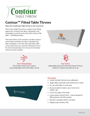 Take the traditional table throw to the next level. The Countour Table Throw has a modern, form-fitting appearance. Printed in one piece, the graphics and messaging can extend across the entire surface of the table -- including the sides.